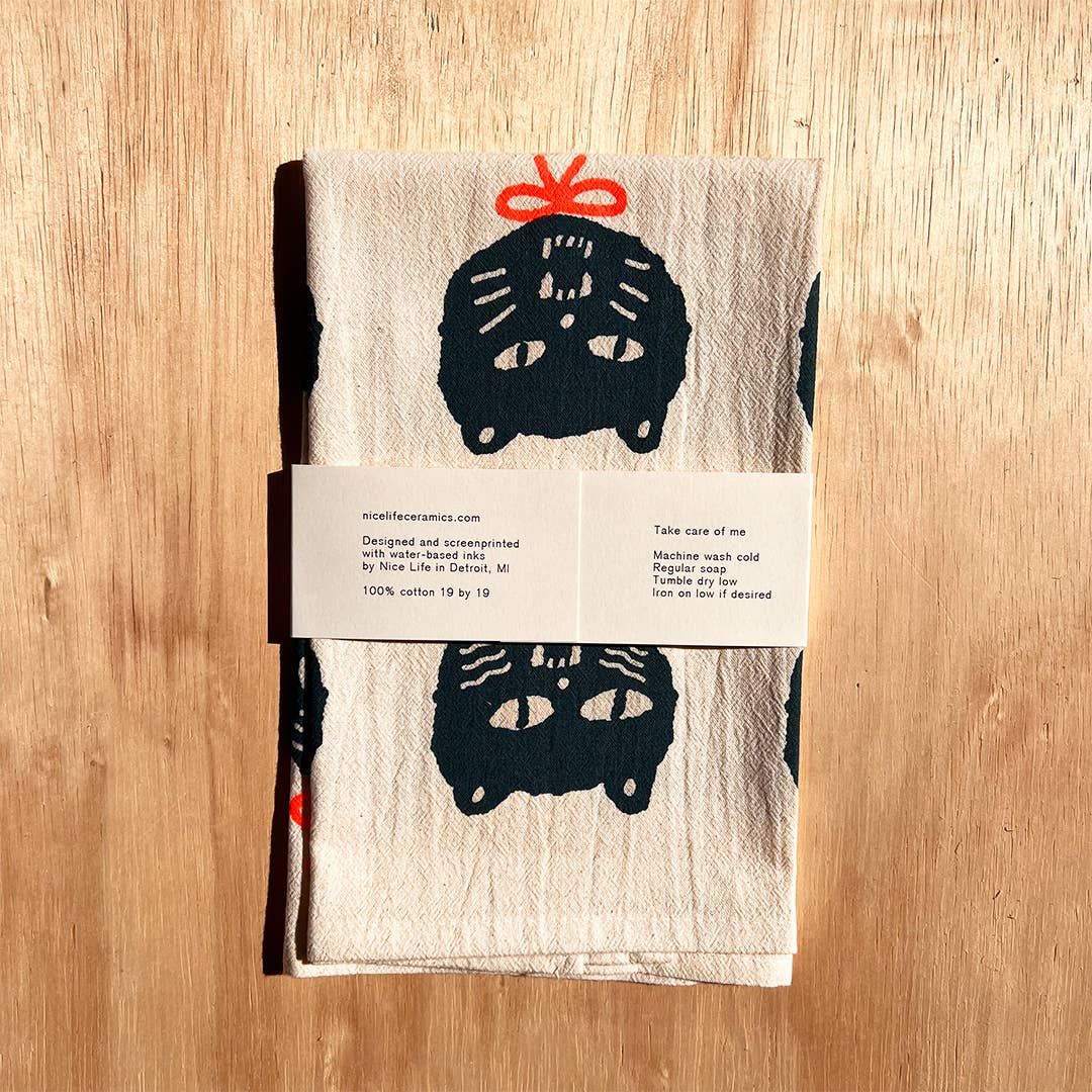 Welcome to the whimsical world of Nice Life. Our BAD CATS Tea Towel is an essential addition to your kitchen. Crafted in our Detroit-based artist studio, each piece is screen printed and hand-cured, embodying our commitment to small batch production. Our meticulous process ensures every towel meets our standards. Embrace our sustainable and eco-friendly approach to home living. Brighten your kitchen experience with our unique, playful design.
