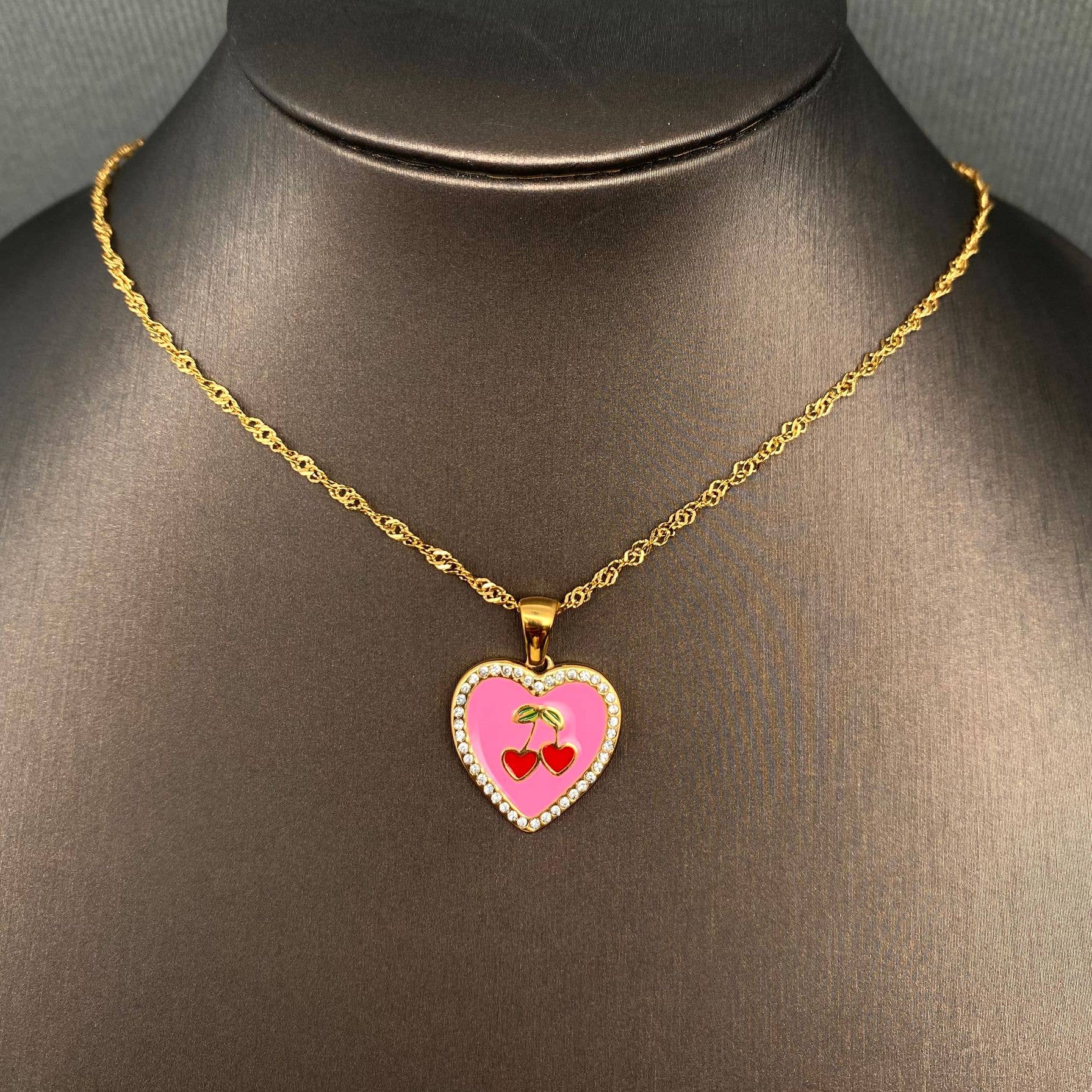 Enamel Cherry Heart Charm Necklace, 18K Gold Plated