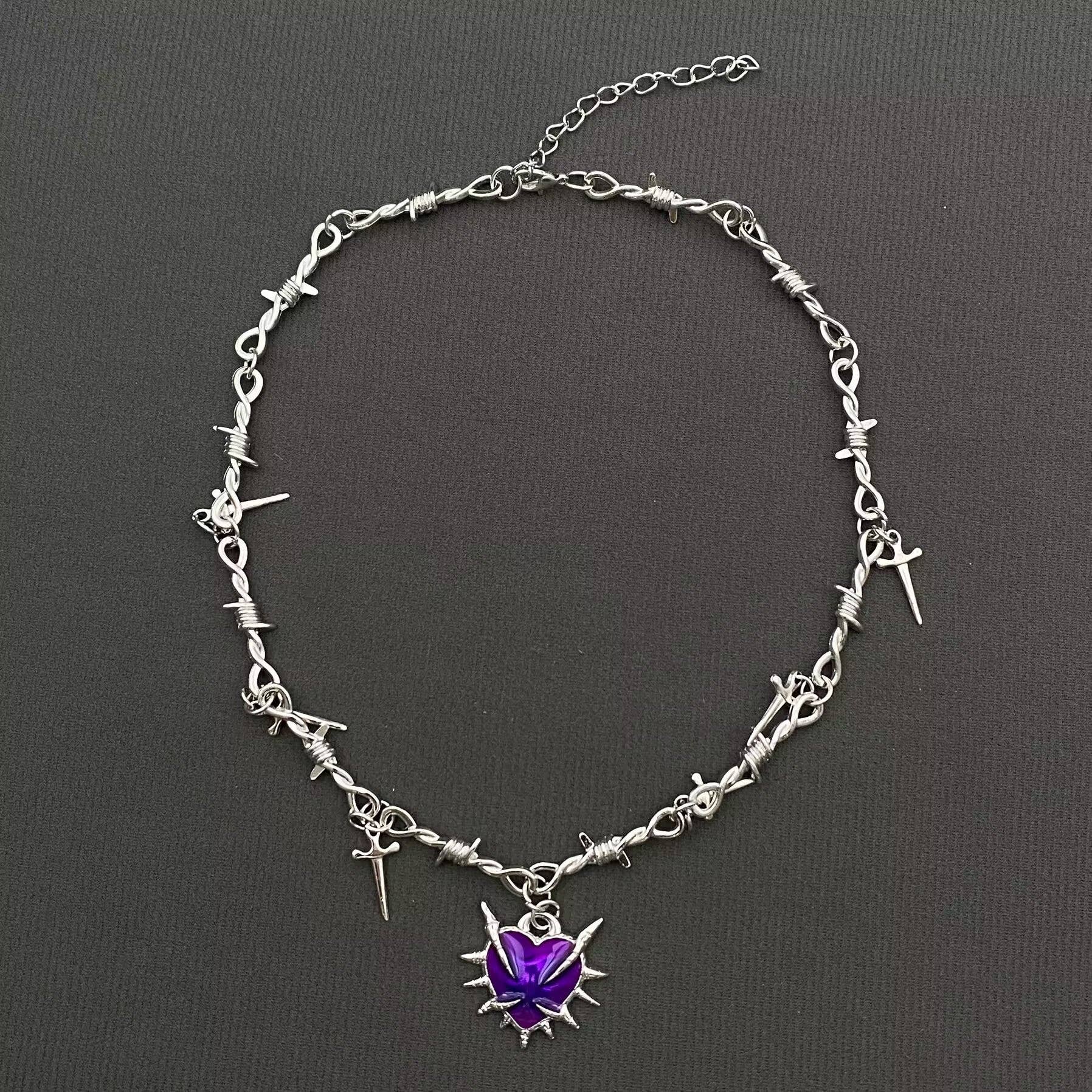 Gothic Purple Thorns Drippy Heart Dagger Charm Barbed-Wire Necklace, Silver Color