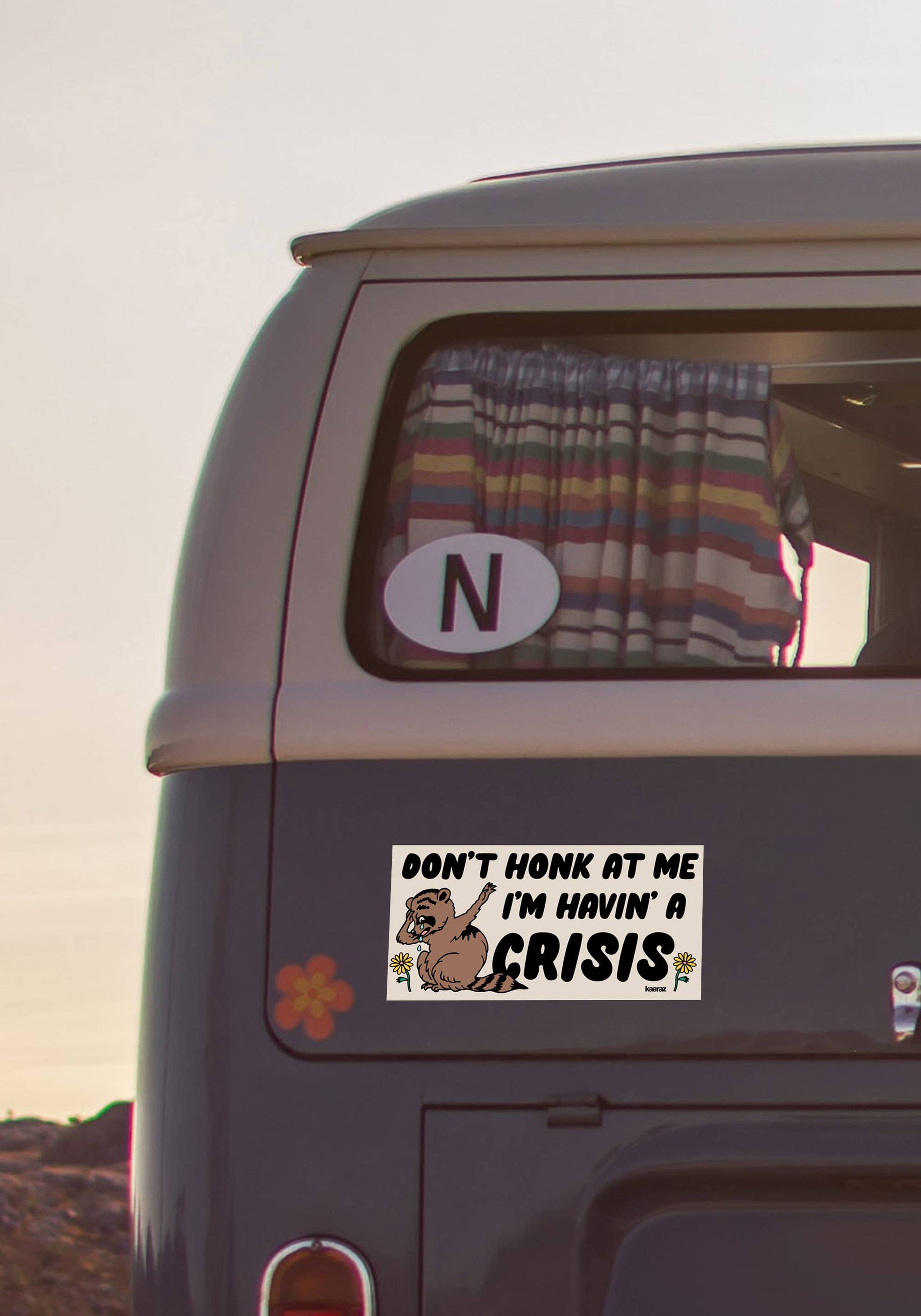Don't honk at me...I'm havin' a crisis! Get a little dramatic with this retro inspired bumper sticker. Perfect for your vehicle, but would also work great on a laptop or other rad surface.