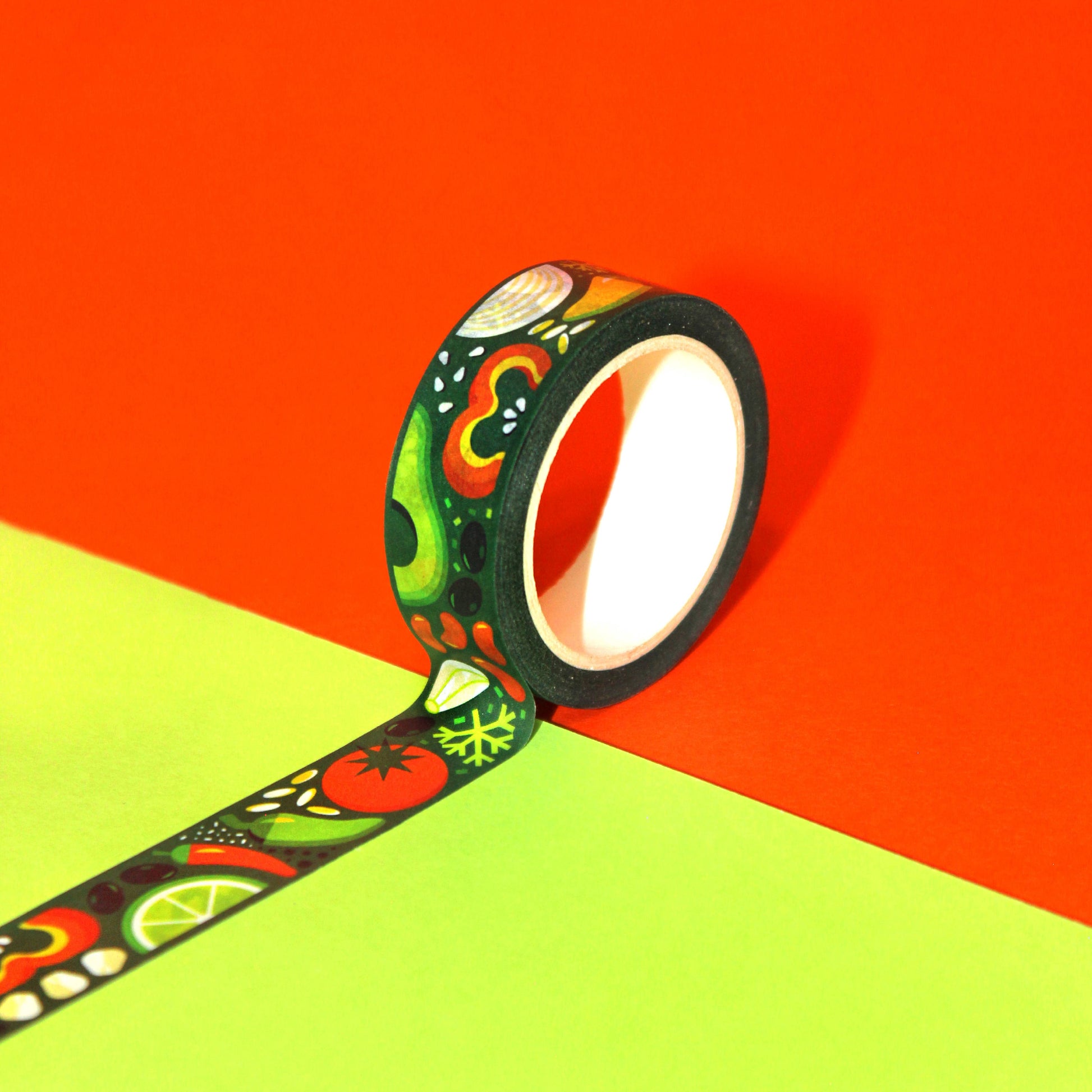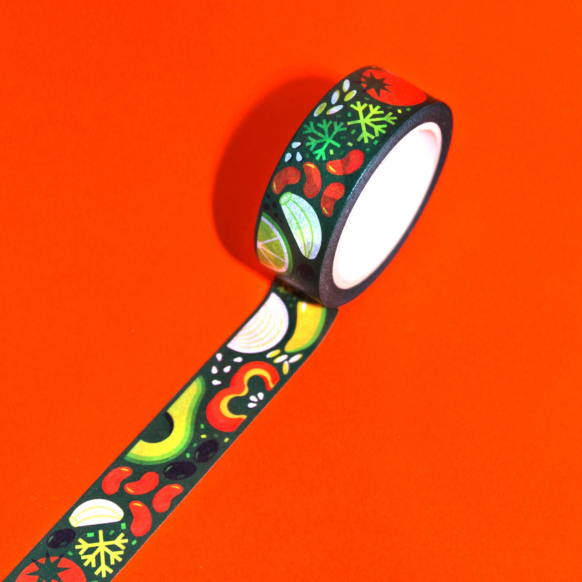 Calling all foodies, especially if you love Latin cuisine, you'll adore this washi tape! It's a foodie's dream come true, featuring a vibrant illustration of avocado, tomatoes, peppers, hominy, various types of beans, and more.