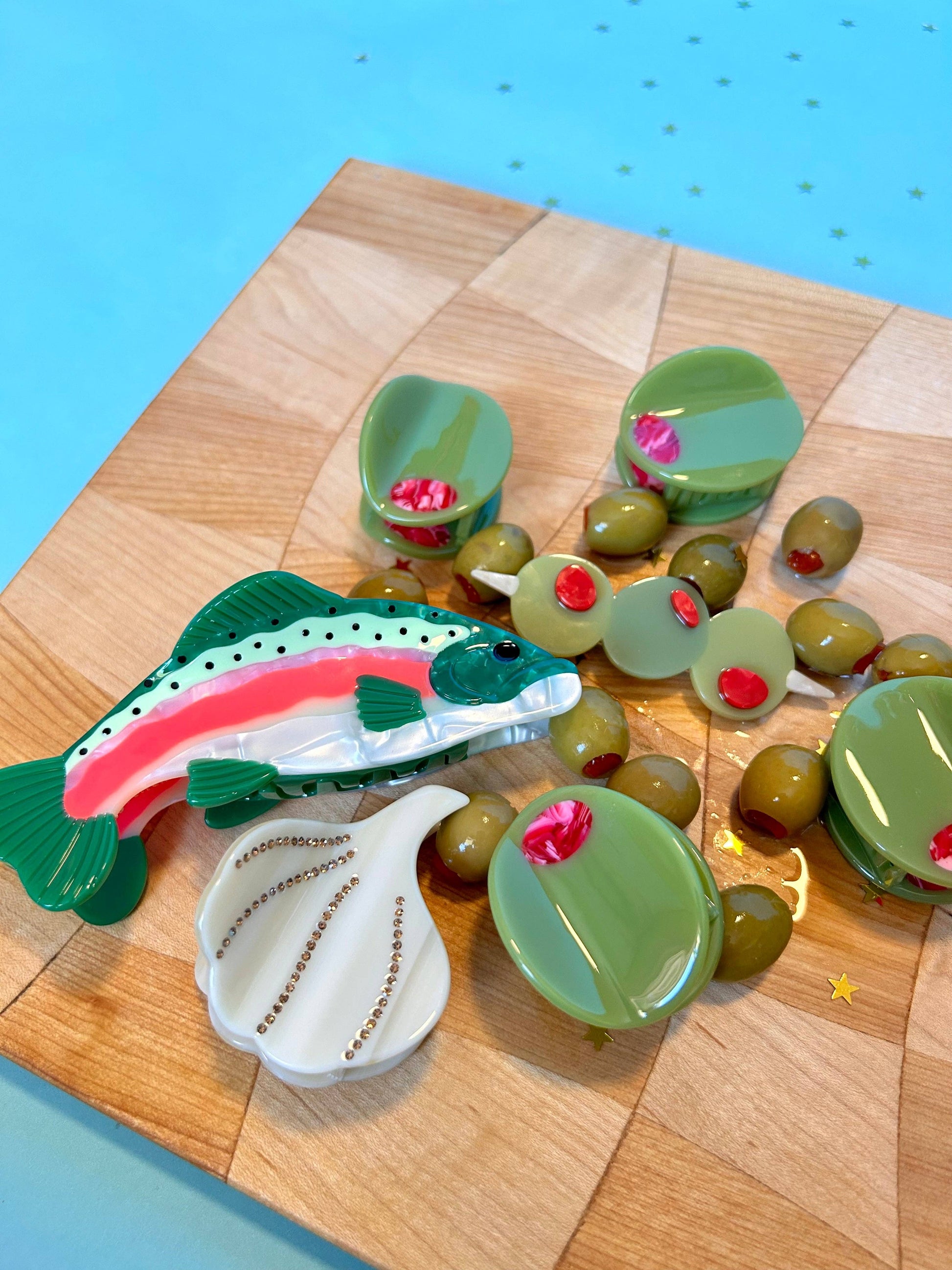 Women want it, fish fear it. It's the rainbow trout hair claw here to bring you some Bass Pro Shop Chic, complete with black rhinestone spots. Made of eco-friendly cellulose acetate (made from plants!)