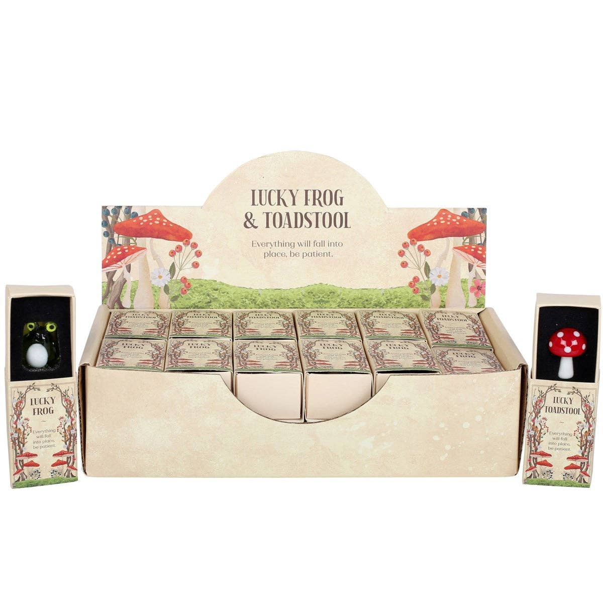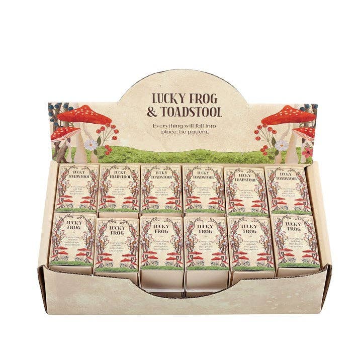 Carry a bit of forest magic everywhere you go with this petite lucky charm. Offered in adorable green frog and red toadstool designs, these tiny glass figures come presented in a sliding matchbox with 'Everything will fall into place' text for adding a dash of extra encouragement. Sold as a set of 24 lucky charms (equally assorted) in a matching cardboard display box. Designed by Something Different and part of the Enhancted Forest collection of magical home decor and gifts.