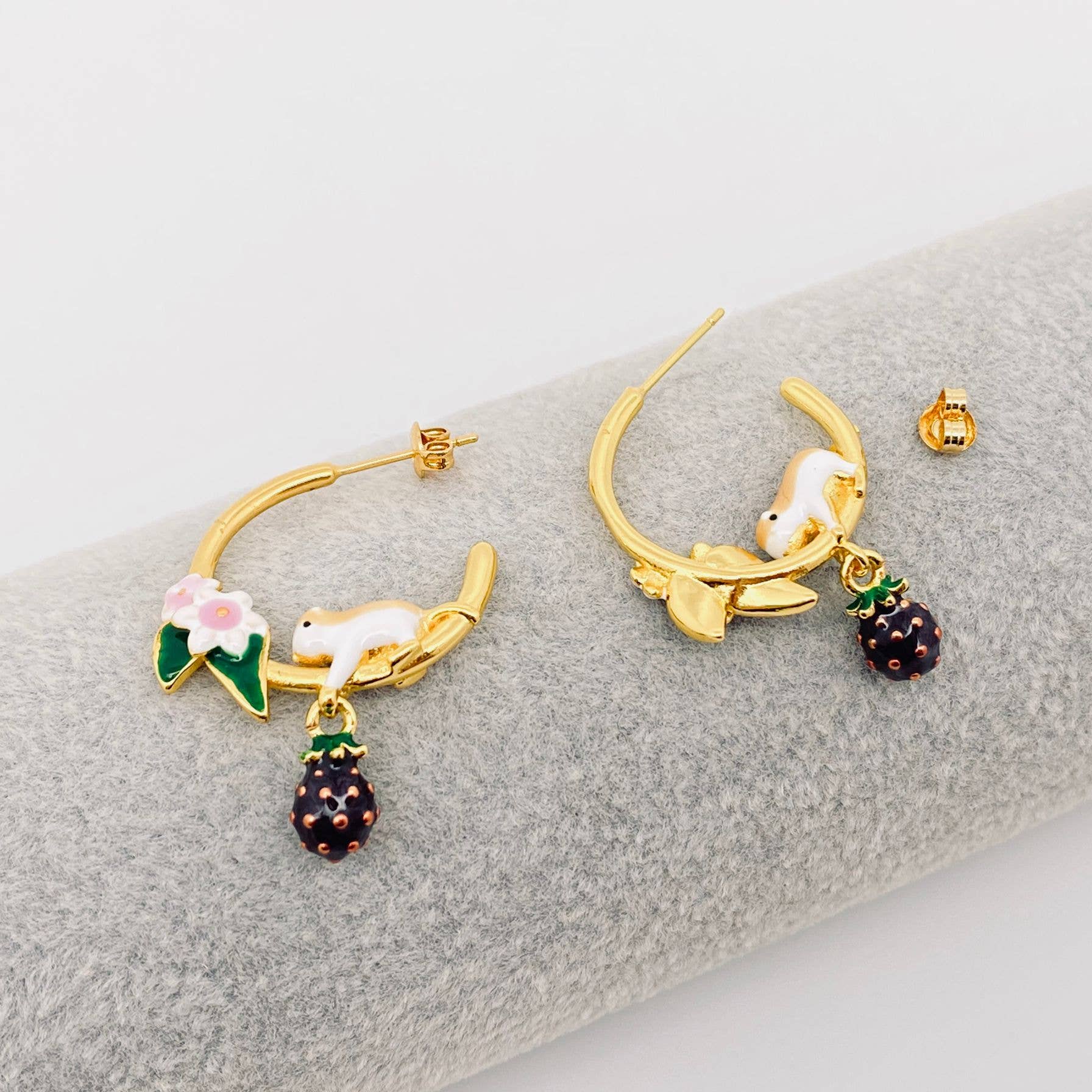 Hamster Picking Raspberrie Enamel Hoop Earrings, Gold Color