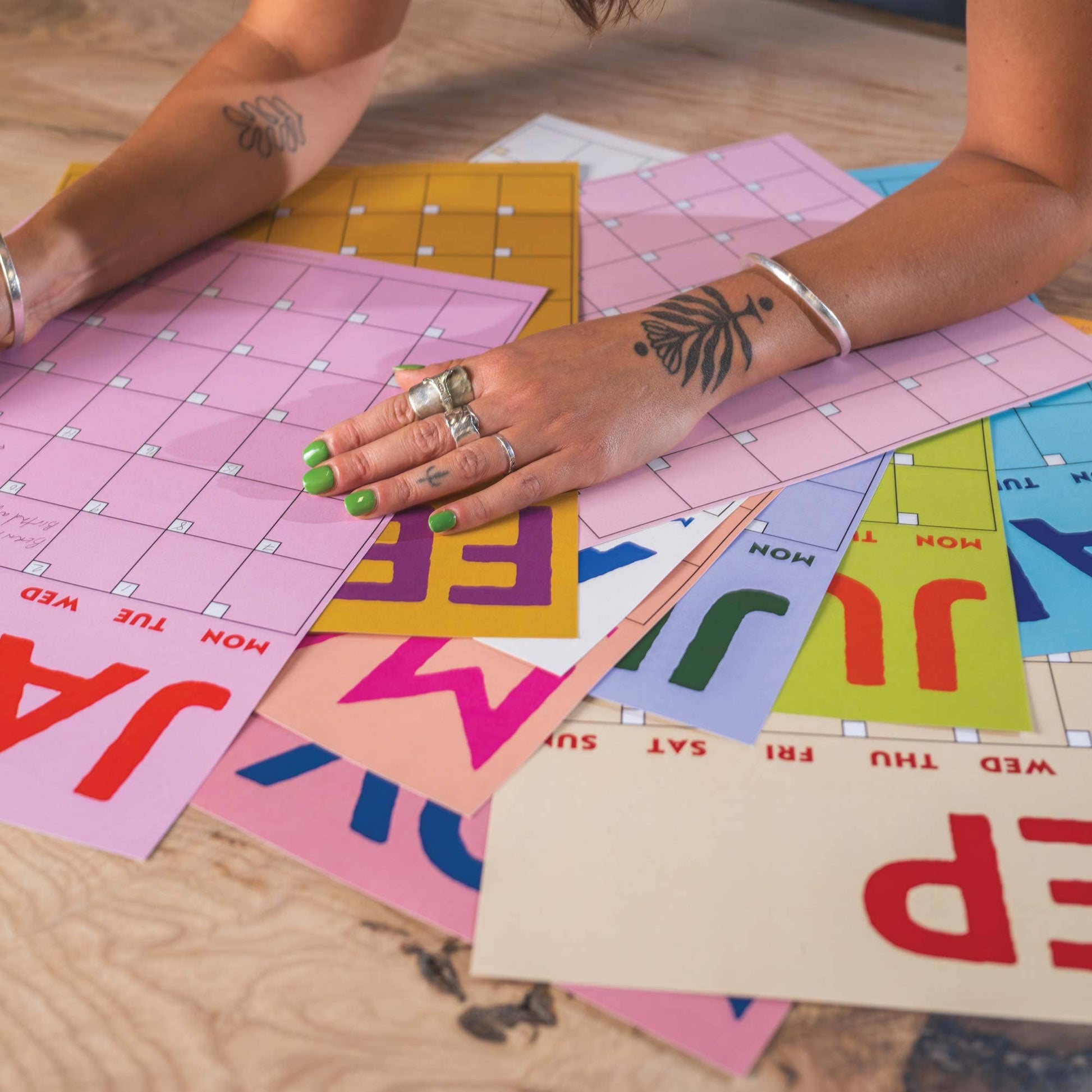 This calendar is desirable all year round, as the user adds the dates in as they need. This calendar is designed with our North American customers in mind where the week starts on Sunday. A 12-page, undated planner which can be hung as a large wall planner or as individual A3 prints. Bold, fun colours in modern typography with a minimalist inspired grid. Please note: week starts Sunday (Monday start also available) Product Details: • 12 x separate prints • A3: 11.7 x 16.5 inches // 29.7 x 42 cm (hung together, they will cover an area of around 1.5m2) • Size of individual date boxes: 1.7 x 1.9 inches // 4.1 x 4.6cm • 101 lb matte paper (easy to write on and doesn’t bleed) - (150gsm) • Undated, 12 Months: January - December • Week starts on Sunday • 100% recycled and recyclable paper • International planner - no holidays included Plastic Free Packaging: Comes presented flat in an A3 glassine cover with a product info sticker.