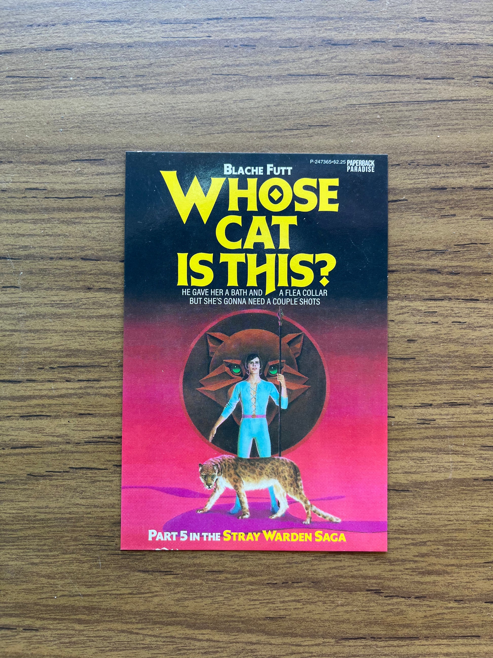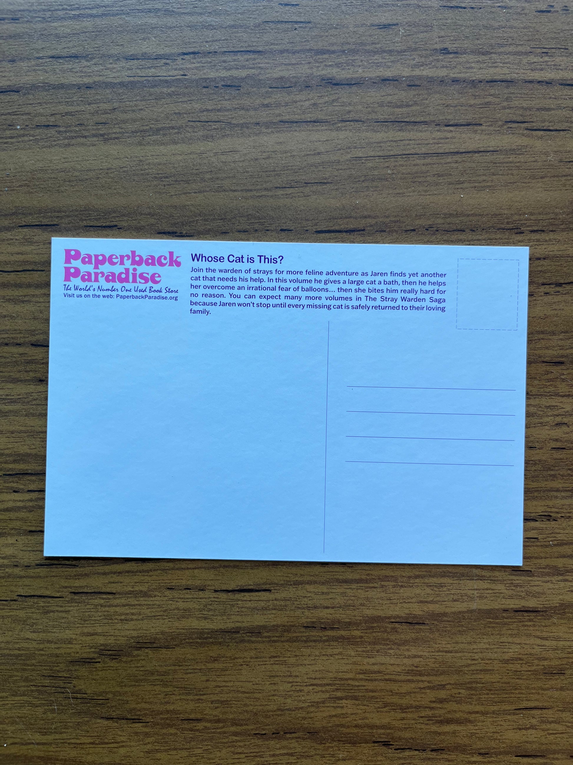 6 x 4 bookmark that fits nicely into any book. Printed on 14 pt cardstock, UV gloss coating on the front to ensure durability, matte finish on the back that features a brief synopsis of the book, space to write an address and message, along with Paperback Paradise branding.